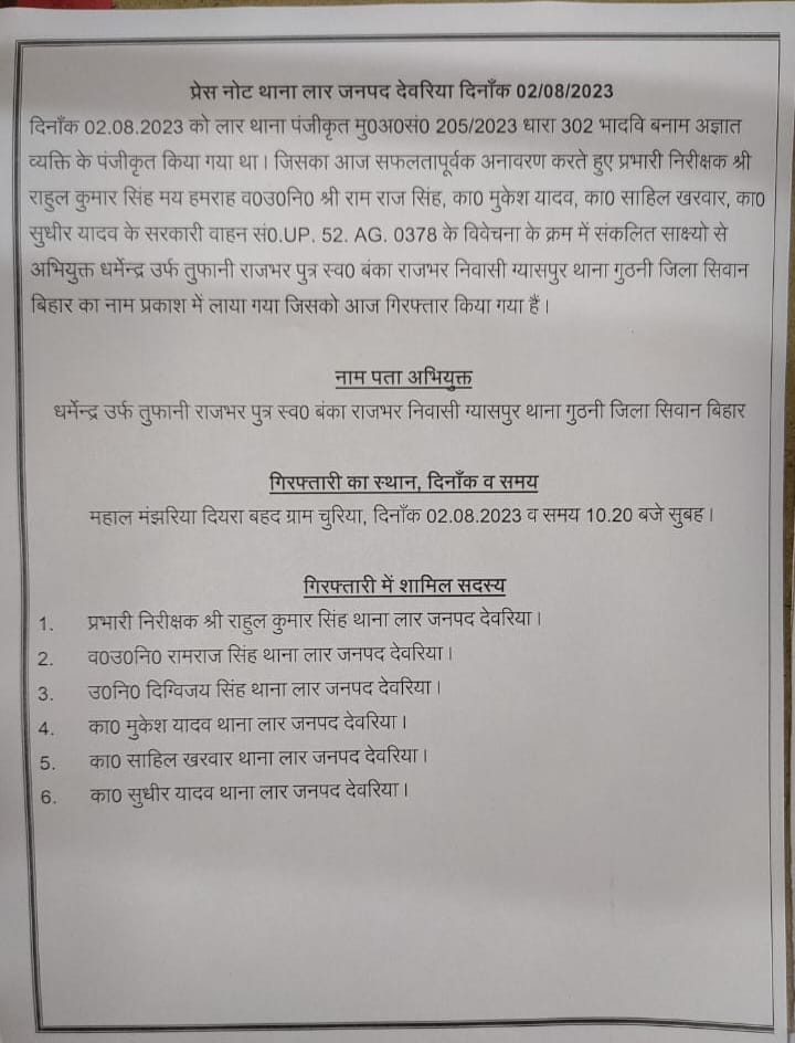 गुठनी के ग्यासपुर गांव निवासी बंका राजभर हत्याकांड का खुलासा बुधवार को यूपी पुलिस ने कर दिया और हत्या का आरोप बंका के मंदबुध्दि पुत्र धर्मेंद्र उर्फ तूफानी राजभर पर लगाते हुये उसे गिरफ्तार कर न्यायिक हिरासत में भेज दिया। यूपी की लार पुलिस ने प्रेस विज्ञप्ति जारी कर उक्त जानकारी दी है। बुधवार को जारी प्रेस विज्ञप्ति में लार पुलिस ने लिखा है कि पंजीकृत मुकदमा संख्या 205/23 धारा 302 भादवी के अनुसंधान के क्रम में प्राप्त साक्ष्य के आधार पर धर्मेंद्र उर्फ तूफानी राजभर का नाम प्रकाश में आया जिसको गिरफ्तार कर न्यायिक हिरासत में भेज दिया। पिता की हत्या का जुर्म मंदबुद्धि पुत्र पर ही पुलिस द्वारा मुकर्रर करने पर उसके परिजनों ने असंतोष जताया है। परिजनों में पुलिस की प्रति अविश्वास कायम हो गया है। हत्या के शिकार बंका राजभर के परिजनों का कहना है कि तूफानी अपने पिता की हत्या नही कर सकता है वह मंदबुध्दि का है और पिता से काफी लगाव रखता था।
